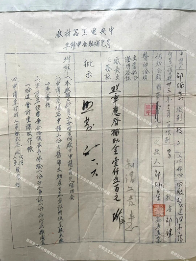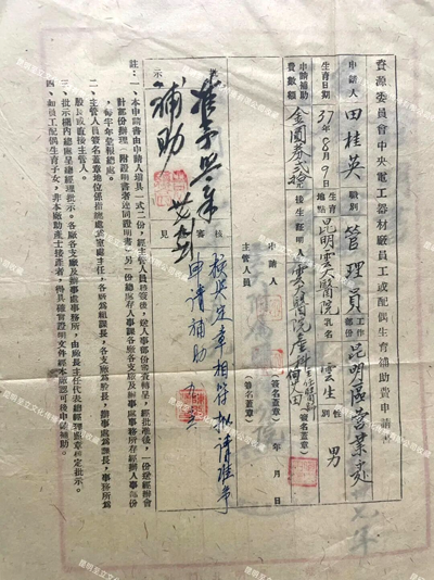 ▲1943年1月,中央電工器材廠(昆明電纜集團(tuán)前身)發(fā)放職工育兒補(bǔ)助國(guó)幣200元。